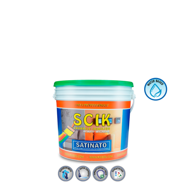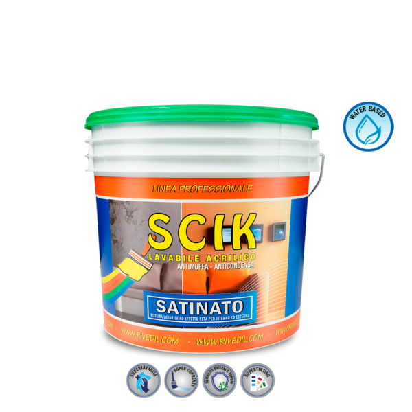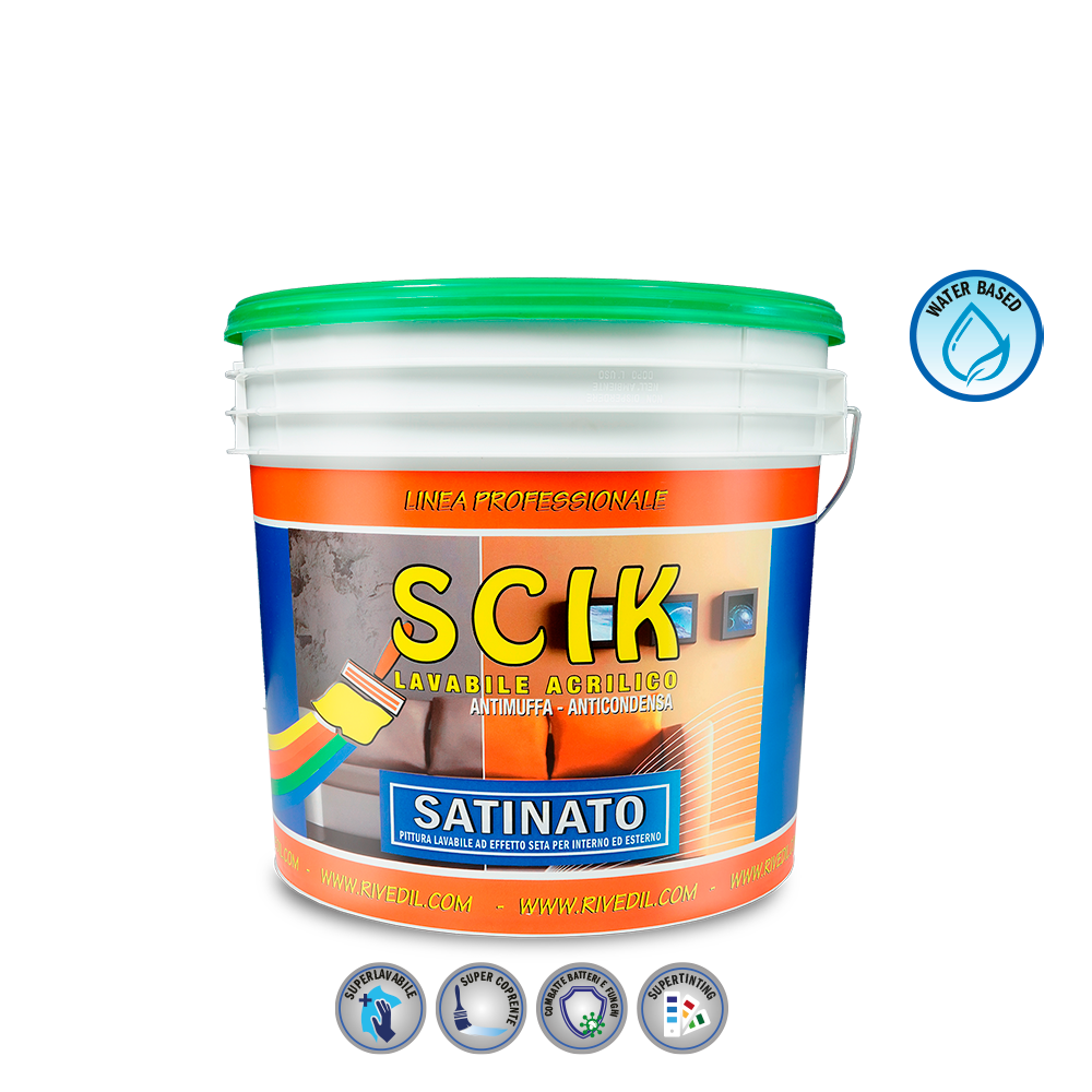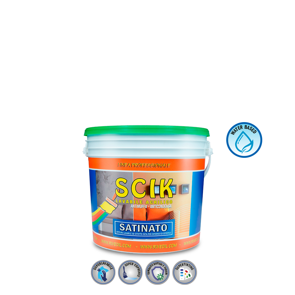 Pittura acrilica superlavabile per interni ed esterni ad effetto seta. Battericida.